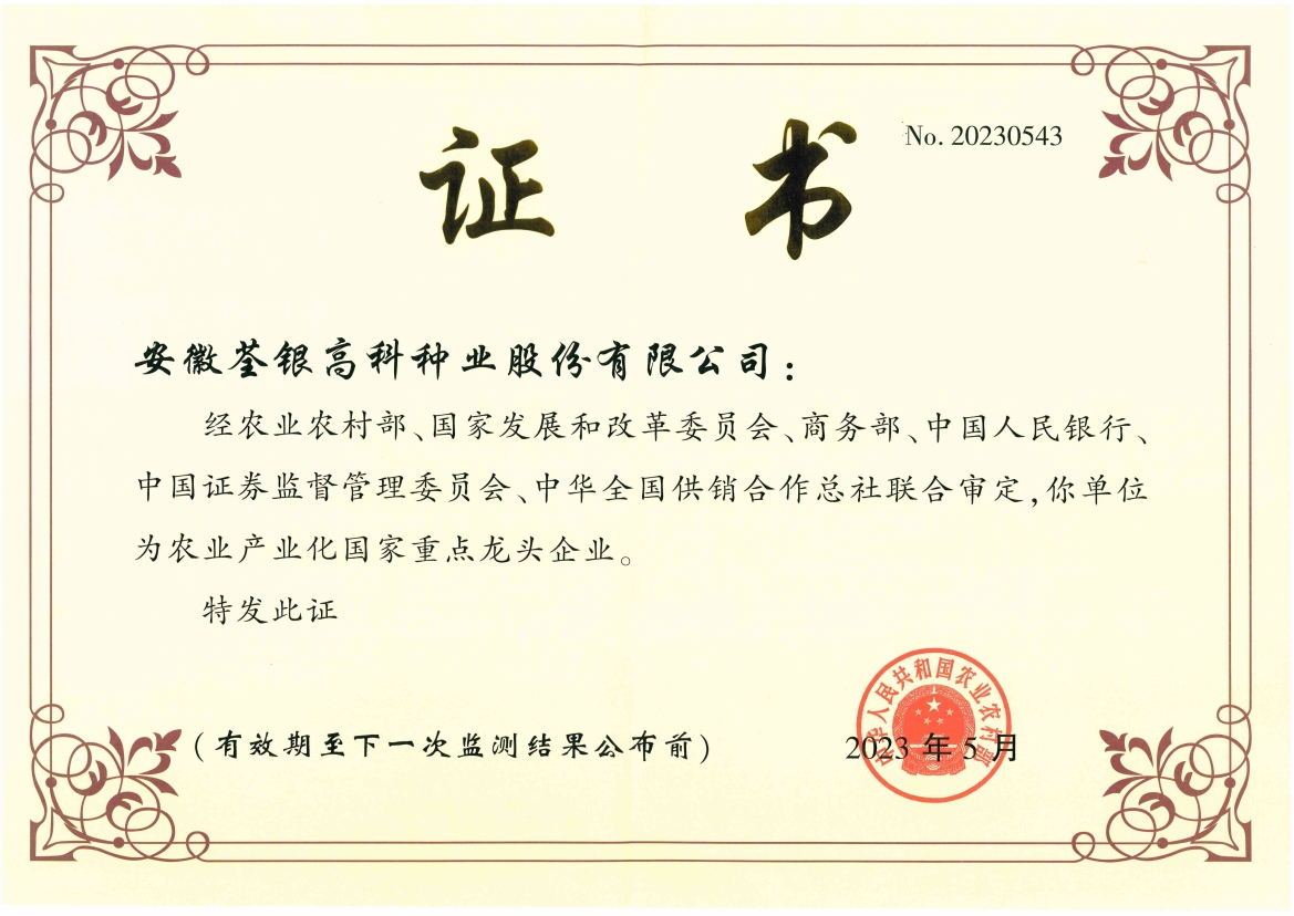 安徽荃銀高科種業股份有限公司是一家“以種業為核心、農業服務為延伸、探索和創(chuàng)新農業多元化發(fā)展”的現代高科技種業上市公司,證券代碼:300087。公司注冊資金9.47億元,系“中國種業領軍企業、農業產業化國家重點龍頭企業、國家高新技術企業、農業部首批農作物種子育繁推一體化企業、中國種業信用明星企業"。在國內控股子公司20多家,在國外設立分支機構4家,良種銷售至全國20多個省(市、區),出口覆蓋20多個國家與地區,種業綜合實力、雜交水稻研發(fā)、推廣及海外業務規(guī)模均居全國種子企業前2位。